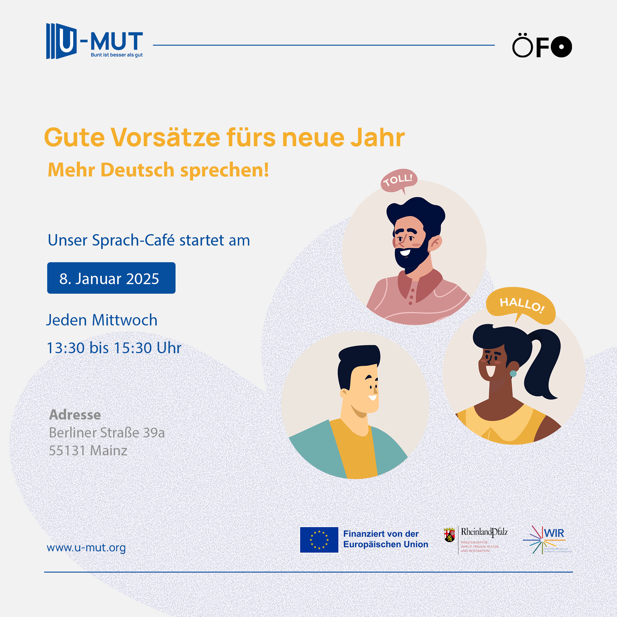 NewsGute Vorsätze fürs neue Jahr: Mehr Deutsch sprechen!5. Januar 20255. Januar 2025admin 🤸🏻♀🎤💬 Unser Sprach-Café startet wieder am 8. Januar 2025!📅 Wann? Jeden Mittwoch, 13:30–15:30 Uhr📍 Wo? Berliner Straße 39a, 55131 Mainz Keine Anmeldung nötig – einfach vorbeikommen und mitmachen! 🤩Wir freuen uns auf euch! 💬✨